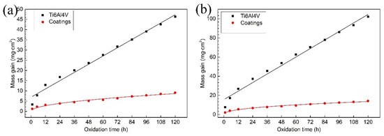 The oxidation kinetics law is influenced by oxidation temperature and oxidation time. Thus, generally speaking, the mathematic relation between oxidation mass gain and oxidation time is used to explain the oxidation behavior of materials. Figure 8 shows the mass gain curves of the samples in the isothermal oxidation tests. By comparing the curve of Ti6Al4V alloy to that of the composite coatings, the oxidation mass gain of the composite coatings is comparatively less. This illustrated that the oxidation film of the composite coatings could prevent them from being oxidized further. From Figure 8a, it is clearly evident that the oxidation kinetics law of Ti6Al4V alloy is linear, which demonstrates that this oxidation film has poor oxidation resistance. The oxidation mass gain of the composite coatings is relatively high at an earlier stage, and then tends to be stable gradually. A parabola relationship between oxidation mass gain and oxidation time is presented. Therefore, the oxidation film on the surface of the composite coatings is protective and could lower the oxidation rate. As demonstrated in Figure 8b, the oxidation kinetics law at 850 °C is similar to that at 650 °C. It can been seen that the oxidation mass gain of Ti6Al4V alloy is larger, and the oxidation rate is also higher. The mass gain of the composite coatings is 14.2 mg/cm2 after isothermal oxidation tests for 120 h, which decreases by 86.1% compared with that of the substrate (102.1 mg/cm2). Though the mass gain of the composite coatings at 850 °C is larger than that at 650 °C, on the whole, the relationship between oxidation mass gain and oxidation time still remains in the shape of a parabola. As a rule, the higher the temperature is, the more violent the atomic motion is. This is why the mass gain increased.