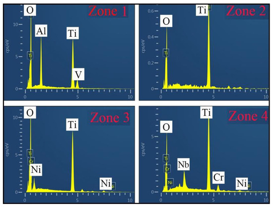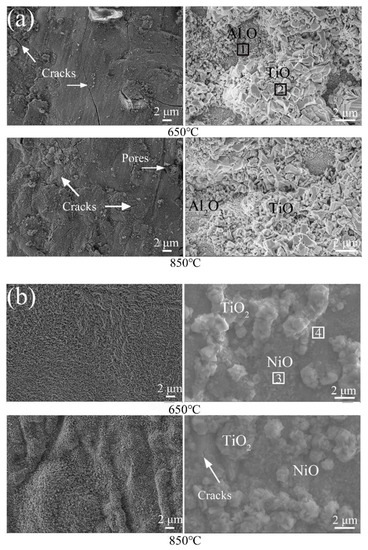 Figure 10 shows the surface oxidation film of the samples after isothermal oxidation tests for 120 h. Figure 11 gives the EDS results of the marker locations in Figure 10. From Figure 10a, the surface oxidation film of Ti6Al4V alloy is composed of a large number of TiO2 and a small number of Al2O3 [26,27]. Cracks and pores were observed. TiO2 with greater brittleness will be liable to cracking and fall out. Moreover, the looser structure will provide access to oxygen and accelerate its diffusion [28]. In addition, TiO2 oxide has a relatively low dissociation pressure at a temperature of 2000 K. As a result, Ti6Al4V alloy will still continue to react with oxygen even though its surface is covered with TiO2 oxidation film. By comparing the surface of Ti6Al4V alloy at 650 °C and at 850 °C, there are more cracks in the oxidation film at 850 °C. From Figure 10b, the surface oxidation film of the composite coatings is mainly composed of a mixture of oxides, such as TiO2 and NiO [29]. In zone 4, the chemical compositions are composed of 27.35 at.% Ti-62.18 at.% O-7.85 at.%. Nb-1.75 at.% Cr-0.87 at.% Ni. Due to the dissolving of Nb in Ti, TixNb1-xO2 will be formed by the means of the replacing of Ti4+ ions in TiO2 by Nb5+ ions [30,31]. Compared with the oxidation film of Ti6Al4V alloy, that of the composite coatings is more compact. This oxidation film formed a protective layer with the function of hindering the transmission of oxidation, and hence the oxidation process was weakened. However, small cracks are observed in the composite coatings at 850 °C. Consequently, this can be used to explain why the mass grain at 850 °C is larger than that at 650 °C.