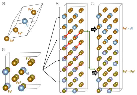 Visualizations of (super-)cells that were used in our theoretical study. Part (a) shows a rhombohedral primitive unit cell of FeAl with 4 atoms and includes a naming convention of Fe sublattices when Fe sites are twice more abundant than the Fe sites. Part (b) exhibits a 16-atom cube-shaped elementary cell containing 4 formula units. A 64-atom supercell, as an 1 × 1 × 4 multiple of the 16-atom elementary cell, is visualized in part (c) and includes red vectors defining a shift characterizing the studied type of antiphase boundaries (APBs). When applying the APB shift to the central half of the 64-atom supercell in part (c) an APB-containing supercell shown in part (d) is formed. To (i) keep the stoichiometry and (ii) apply the ⟨111⟩ shift to all atoms in the middle half of (c), one atomic plane is cyclically shifted as schematically marked by a series of green arrows (an APB shift applies also to this plane). There are two APB interfaces per each 64-atom supercell shown in part (c). One is formed by two adjacent layers containing both Fe and Al atoms (the Fe-Al APB interface) and the second one consisting of two planes of Fe atoms (the Fe-Fe APB interface).