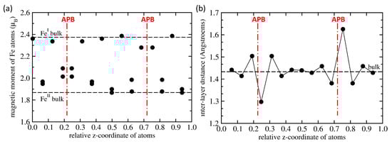 As seen in Figure 2a, the impact of APBs includes one or two layers of iron atoms apart from APB interfaces. The local magnetic moments of Fe atoms in the middle of the 64-atom supercell, which are furthest from the APB interfaces (e.g., = 2.386 for z = 0.5602 and = 1.899 for z = 0.4984), are very similar to those in the bulk ( = 2.374 and = 1.868 ). This we interpret so that our 64-atom supercell is big enough to eliminate most of spurious interactions between periodic images.