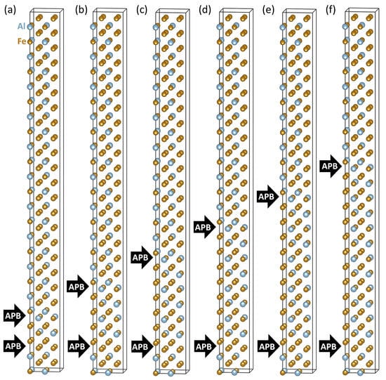 Schematic visualizations of 192-atom supercells (1 × 1 × 12 multiples of the 16-atom cell shown in Figure 1b) that we used for examining possible long-range interactions between the two APB interfaces. The studied Fe-Fe and Fe-Al APB interfaces were separated by one 16-atom FeAl unit, i.e., 4 atomic planes (a), two 16-atom FeAl units (b), three 16-atom FeAl units (c), four 16-atom FeAl units (d), five 16-atom FeAl units (e) and six 16-atom FeAl units, i.e., 24 atomic planes (f).