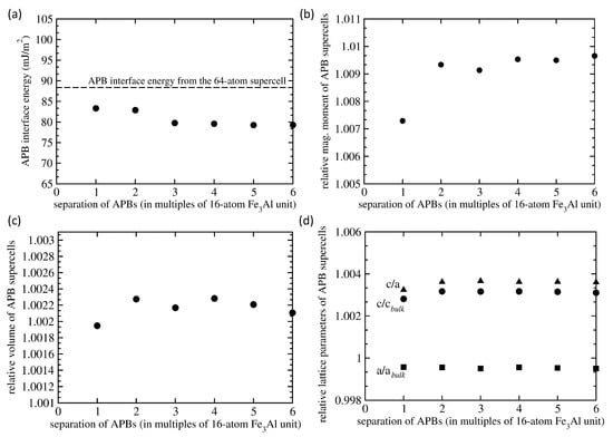 Regarding the magnetic properties, relative differences of total magnetic moment per 192-atom supercells with respect to the same amount of APB-free bulk FeAl is shown in Figure 4b. The total magnetic moment is found to increase only very slightly by less than 1% for the most distant APB interfaces. The computed volume (again relative to the defect-free bulk) is visualized in Figure 4c and the individual lattice parameters a and c in Figure 4d. Only very small changes are found to be induced by well separated APB interfaces. The structural defect-related changes are important for the stability of defects because significant changes in the volume would induce significant strains and stresses close to the defect or in the defect-free matrix surrounding the defect. These strains would then cause additional elastic strain energies that would be added to the computed interface energies. However, the APBs increase the volume by only about 0.2%. This small change is likely due to the fact that the APB-containing lattice slightly shirks in directions within the interface plane, i.e., lattice parameter a, but slightly expands in the direction perpendicular to the APB interfaces (the c lattice parameter).