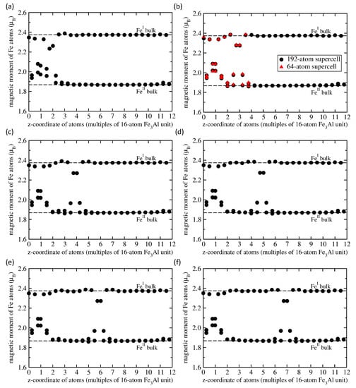 The small change in the value of the total magnetic moment is caused by nearly perfect compensation of these positive and negative changes. The series of sub-figures in Figure 5 for the pair of APB interfaces separated by different distances indicates that each of the APB interfaces induces rather specific pattern of changes in the neighboring Fe atoms. While this pattern is not well recognizable in the case of APB interfaces separated by only four atomic planes in Figure 5a, it is nearly identical for other distances between the interfaces in Figure 5b–f. In particular, the local magnetic moments of Fe atoms in a 192-atom supercell summarized in Figure 3b as black circles in Figure 5b are accompanied by the values (red triangles) that were obtained for the Fe atoms in the 64-atom supercell shown in Figure 1d. These values are also presented in Figure 2a. The overlap of these two data sets neatly illustrates the fact that already the 64-atom 1 × 1 × 4 supercell is big enough for computing the properties of the studied APBs (it also means that the impact of APBs on local magnetic moments is rather localized).