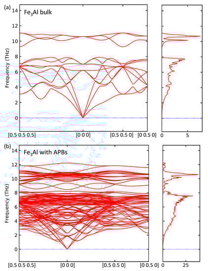 Having the above-discussed confirmation that the 64-atom 1 × 1 × 4 supercell is big enough for our computational purposes, we also analysed APB-related changes induced in vibrational properties. The PHONOPY software [63] generated in total 64 atomic displacements for the 64-atom supercell shown in Figure 1d. We computed forces due to these atomic displacements using 256-atom 2 × 2 × 1 multiples of the 64-atom supercell, i.e., 2 × 2 × 4 multiples of the 16-atom cell. The calculations were performed employing (i) an additional support grid for the evaluation of the augmentation charges (in VASP) and (ii) symmetrization of forces (in PHONOPY). The resulting phonon spectra and densities of phonon states for both defect-free FeAl (the supercell shown in Figure 1c) and the 64-atom supercell with APBs shown in Figure 1d are presented in Figure 6a,b, respectively.