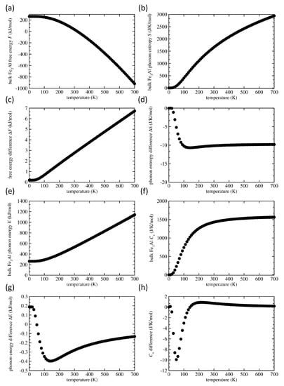 The results for the bulk FeAl (without any APBs) and the differences induced by APBs (such as ) are summarized in Figure 7 as a function of temperature. The Helmholtz free energy F in the defect-free bulk FeAl is depicted in Figure 7a. It is higher when APBs are introduced into the system (see Figure 7c) and the difference is growing with increasing temperature as a clear impact of vibrational entropy terms. The free-energy change is a few kJ/mol, i.e., it is rather small because 1 kJ/mol represents in our case about 0.1625 meV/atom energy difference between the two 64-atom supercells (note that the total-energy difference without vibrations induced by both APBs is about 5.7 meV/atom as discussed above). In terms of the averaged APB interface energy, 1 kJ/mol corresponds to a change of about 2.5 mJ/m. The fact that the change is positive, i.e., thermal vibrations destabilize the APBs with increasing temperature, is not intuitive but both positive and negative changes were reported earlier for APBs in L1-structure NiAl [69]. The vibrational entropy S for the perfect bulk FeAl is shown in Figure 7b. The APB-induced changes are negative, i.e., the vibrational entropy of FeAl with APBs is lower (see Figure 7d). The harmonic phonon energy E for the defect-free bulk in Figure 7e increases with temperature but APB-induced changes are rather complex (see Figure 7g), from positive values below T = 50 K to negative ones above this threshold temperature (at least within the analyzed temperature range up to 700 K).