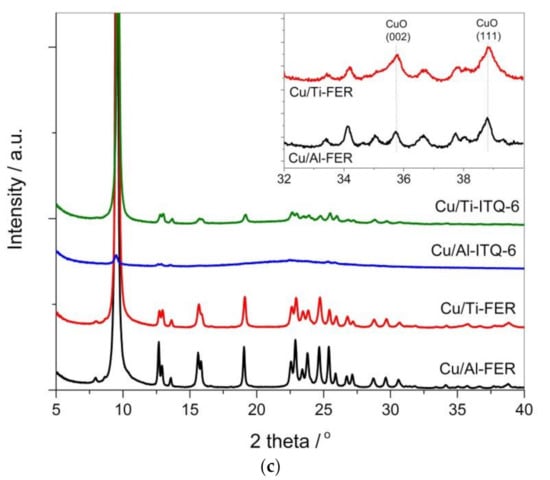 A diffractogram recorded for the zeolitic samples doped with copper are presented in Figure 1c. The reflections characteristic of zeolite structures were not changed after copper deposition. However, in the case of Al-FER and Ti-FER there were low-intensive reflections, indicating the presence of small CuO crystallites, which were identified (Figure 1c). Such crystallites, due to the microporous character of ferrierite, are located outside the porous system of the samples. In diffractograms of Cu-Al-ITQ-6 and Cu-Ti-ITQ-6, such reflections are not present.