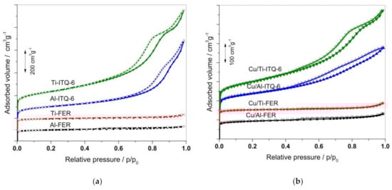 Dinitrogen adsorption–desorption isotherms of the zeolitic samples and their modifications with copper are shown in Figure 2. The isotherms measured for ferrierites, Al-FER and Ti-FER, and presented in Figure 2a, are classified as type I according to the IUPAC recommendations [] and are typical of microporous materials. An adsorption step at a very low relative pressure is related to capillary condensation of dinitrogen inside micropores and proves the microporous character of the samples. The isotherms measured for Al-ITQ-6 and Ti-ITQ-6 are classified as type IV according to the IUPAC standards [] and are typical of mesoporous materials (Figure 2a). An adsorption step observed in low range of the relative pressure indicates the presence of micropores in this series of the samples. Thus, the isotherms of Al-ITQ-6 and Ti-ITQ-6 show a bimodal type of porosity in these samples. Micropores are channels in the zeolite layers, while mesopores are spaces between non-parallel oriented zeolite layers. The hysteresis loops present in isotherms of Al-ITQ-6 and Ti-ITQ-6 are classified as H3 and are characteristic of non-rigid aggregates of plate-like particles []. The neckings in the hysteresis loops indicate partial plugging of mesopores []. Deposition of copper into the zeolite samples did not result in significant modifications of their isotherm profiles (Figure 2b).