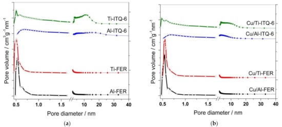 Pore size distributions determined for Al-, Ti-zeolites in micropore and mesopore range (a) and their Cu-modified forms (b).