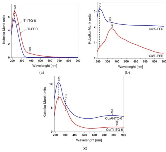 The form and aggregation of titanium and copper in the zeolitic samples were analysed by UV-Vis DR spectroscopy (Figure 4). In the spectra of Ti-FER and Ti-ITQ-6, shown in Figure 4a, the maxima at about 220 nm are attributed to monomeric tetrahedrally coordinated titanium cations in the zeolite framework [,]. Small shoulder above 350 nm in a spectrum of Ti-ITQ-6 is related to extra framework titanium species of various aggregations, from small polymerized hexacoordinated Ti-species containing Ti-O-Ti bridges to small aggregates of TiO2 [,]. Thus, in Ti-FER titanium is present in the form of tetrahedrally coordinated Ti4+ cations incorporated into the zeolite framework. This same form of titanium dominates in Ti-ITQ-6, however in this case there is also a small contribution of titanium in the form of extra framework species.