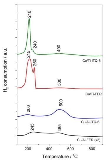 Reducibility of copper species introduced into the zeolite samples was analyzed by a method of temperature-programmed reduction using hydrogen as a reducing agent (H2-TPR). The mechanisms of the copper species reduction strongly depend on their form and aggregation. At temperatures below 300 °C, the reduction of Cu2+ to Cu0 in aggregated copper oxide species and CuO crystals takes place. Reduction of monomeric Cu2+ cations, e.g., in ion-exchange positions, includes two stages. In the first step, below 300 °C, the reduction of Cu2+ to Cu+ occurs. While in the second step, Cu+ to Cu0 is reduced at higher temperatures, typically above 400 °C [,]. Thus, the results of H2-TPR are important for an analysis of the form and aggregation of copper species present in catalysts. Reduction profiles of the copper modified ferrierites, Cu/Al-FER and Cu/Ti-FER, consist of low temperature peaks, which represent both reduction of Cu2+ to Cu0 in aggregated copper species and reduction of monomeric Cu2+ cations to Cu+ (Figure 5). The high temperature broad peaks, assigned to the reduction of monomeric Cu+ cations to Cu0, are located at about 485 °C for Cu/Al-FER and 500 °C for Cu/Ti-FER. The intensity of the Cu/Al-FER reduction profile is lower due to the lower copper loading in this sample. Moreover, low-temperature maximum is much more intensive in the case of Cu/Ti-FER and consists of at least two peaks, possibly indicating a reduction of the copper species of various aggregations. Integration and comparison of the surface areas under low and high temperature maxima leads to an evaluation of copper contribution in the form of monomeric cations and aggregated species. In the cases of Cu/Al-FER, the estimated molar percentage ratio of monomeric to aggregated coppers species is 58/42. For the Cu/Ti-FER, there is a larger contribution of aggregated copper species and the ratio of monomeric to aggregated species is 7/93. In these calculations it was assumed that in the beginning of the H2-TPR run, copper in all species is present only as Cu2+, thus the presented values are only the rough estimation. However, it should be noted that the results of such an estimation are consistent with the results of UV-vis DRS analysis (Figure 4), which showed higher contribution of aggregated copper oxide species in the Cu/Ti-FER sample comparing to Cu/Al-FER. The reduction of copper species in Cu/Al-ITQ-6 and Cu/Ti-ITQ-6 also occurs in the similar temperature ranges (Figure 5). The estimation of the copper species contribution in Cu/Ti-ITQ-6 shows domination of aggraded species (about 90%) with a significantly lower content of monomeric Cu2+ cations (about 10%). A narrow and sharp low-temperature reduction maximum with only small shoulder may indicate high homogeneity of the deposited aggregated copper oxide species. A very surprising reduction profile was obtained for the Cu/Al-ITQ-6 sample. Deconvolution of the reduction profile for the low and high temperature reduction peaks and comparison of the surface areas integrated under these peaks shows that more hydrogen was consumed for the reduction of Cu+ to Cu0 at higher temperatures than for both the reduction of Cu2+ to Cu0 in aggregated species as well as monomeric Cu2+ cations to Cu+ at lower temperatures. This surprising effect is possibly related to the presence of monomeric Cu+ cations in the Cu/Al-ITQ-6 sample in the beginning of the H2-TPR run. Such thermal reduction of Cu2+ to Cu+ that occurred during the sample outgassing has been reported in scientific literature []. The thermal reduction in a flow of helium, used in the samples outgassing step, shows high lability in the reduction of monomeric Cu2+ cations to Cu+ in the Cu/Al-ITQ-6 sample. Another interesting observation is related to the tendency of copper species to aggregation in Ti-zeolites. Possibly this is related to the different interaction of copper species within the Ti- and Al-zeolite framework. In the case of Al-zeolites, Cu/Al-FER and Cu/Al-ITQ-6, copper is present mainly as monomeric Cu2+ or Cu+ cations in ion-exchange positions. Such Coulombic interactions between copper cations and negatively charger zeolite frameworks are relatively strong and therefore sintering of copper species under calcination conditions is limited. The nature of copper cation interactions with the Ti-zeolite framework is much more complex. Part of the ≡Si–O–Ti≡ bridges can be hydrolyzed under treatment with the aqueous solution of copper salt with the formation of weakly acidic ≡Si–OH and ≡Ti–OH, that can act as ion-exchange sites []. Moreover, copper can be attached to ≡Si–O–Ti≡ bridges as a surface complex []. In these cases, copper is attached into the zeolite framework by weaker forces and therefore aggregation of copper species under calcination conditions is much easier compared to Al-zeolites.