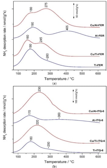 Ammonia desorption profile of Al-FER consists of two peaks centered at about 190 and 405 °C, indicating ammonia desorption from acid sites of weaker and stronger strength, respectively (Figure 6a). Substitution of aluminum by titanium in the Ti-FER framework resulted in disappearance of stronger acid sites. The position of the main low-temperature ammonia desorption peak, 180 °C, indicates the presence of slightly weaker acid sites comparing to sites present in Al-FER. In the case of Al-FER the role of acid sites could play –OH groups in ≡Si–O(H)–Al≡ bridges (Brønsted acid sites) and coordinative unsaturated Al3+ cations of the zeolite framework (Levis acid sites). The situation is more complex in the case of Ti-FER, where acid sites could be ≡Ti–OH groups, which according to Bordiga [] can attach one or even to ammonia molecules. Moreover, ammonia molecules can be adsorbed on Ti3+ cations formed by e.g., charge relocation (O2− Ti4+)→(O− Ti3+). Significant modifications of ammonia desorption profiles were observed after copper deposition into Al-FER and Ti-FER (Figure 6a). Low-temperature peaks were slightly shifted to lower temperatures, indicating the formation of weaker acid sites. Moreover, additional peaks at about 245 and 275 °C appeared in the desorption profiles of Cu/Al-FER and Cu/Ti-FER, respectively. These peaks are possibly directly associated with deposited copper species and the difference in their positions is probably related to various types of copper species in the ferrierite samples—mainly monomeric copper cations in Cu/Al-FER and mainly aggregated copper oxide species in Cu/Ti-FER. It should be noted that the copper loading in Cu/Al-FER is three times lower compared to Cu/Ti-FER, but the concentration of acid sites in the former sample after copper deposition increased more significantly compared to the later one. This is not surprising taking into account the better surface accessibility of the copper species in the form of monomeric cations compared to aggregated copper oxide species. Ammonia desorption profiles of delaminated Al-ITQ-6 and Ti-ITQ-6 samples (Figure 6b) are similar to the profiles of Al-FER and Ti-FER (Figure 6a), respectively.