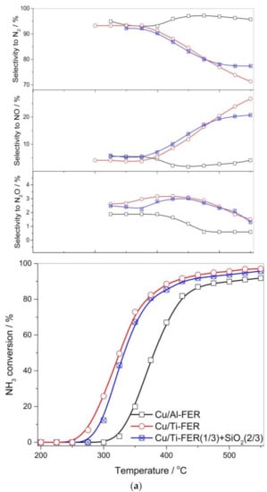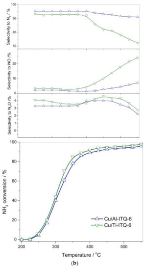 One of the most promising technologies for the elimination of ammonia from flue gases is based on selective catalytic oxidation of ammonia to dinitrogen, NH3-SCO [,]. In this case the role of the oxidising agent plays oxygen present in flue gases and therefore there is no need for additional reactant introduction to the gas stream. The main problem is related to development of the effective catalysts operating in the temperature of flue gases with high selectivity to dinitrogen. The catalytic systems studied in the process of selective ammonia oxidation [] are divided into three main groups: (1) noble metals, which are active in relatively low temperatures but are low-selective to dinitrogen [,,]; (2) transition metal oxides, typically active at higher temperatures but more selective to dinitrogen than noble metals [,,]; and (3) zeolites modified with transition metals, which are catalytically active at temperatures higher than noble metals but are significantly more selective to dinitrogen [,,].
