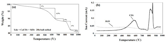 Of the initial powders, only talc and CaCO3 decomposed. Talc released structural H2O during decomposition [23]. Theoretically, 4.7% weight loss can be obtained from this decomposition. However, it was found that talc powder had a weight loss of 15% when heat treated up to 975 °C [23]. This increased weight loss was due to water absorbed by the powder from the atmosphere. CaCO3 releases CO2 during the decomposition with a theoretical weight loss of 44%. Galan et al. [24] found that crystalline CaCO3 with a purity above 99% decomposed with a weight loss of 43%. It has also been shown that both talc and CaCO3 can release absorbed H2O as well [25]. This could explain the consistent release of H2O throughout the TGA.