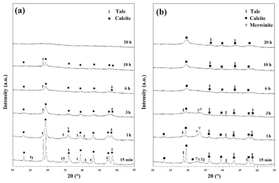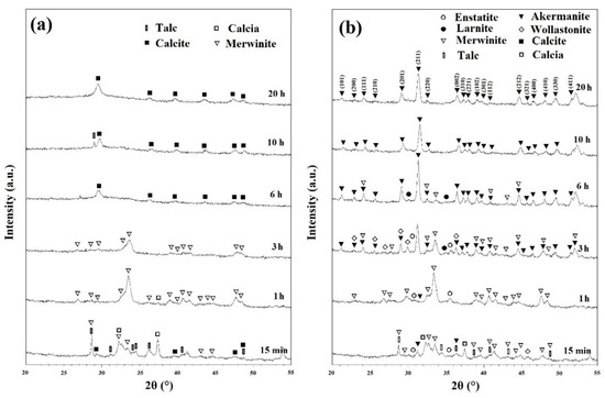X-ray diffraction (XRD) analysis was performed to characterize the ball milled and heat-treated powders. Figure 2a depicts the XRD patterns of the ball milled powders before any heat treatment cycles. The powder ball milled for 15 min showed a distinct structure with sharp peaks. Talc (XRD JCPDS data file No. 00-013-0558) and CaCO3 (Calcite) (XRD JCPDS data file No. 00-005-0586) were both characterized distinctly. However, as can be seen from Figure S1, silica did not show any peaks on the XRD patterns. Further ball milling began to shorten and widen the peaks as a result of induced stresses, reduced grain size, and developing an amorphous state [27]. Once the powders have been ball milled for 20 h, they have become amorphous without any distinct peaks. After heat treatment the ball milled powders at 500 and 600 °C for 1h, there were only minor changes in the peaks which can be seen in Figures S2 and S3, respectively.
