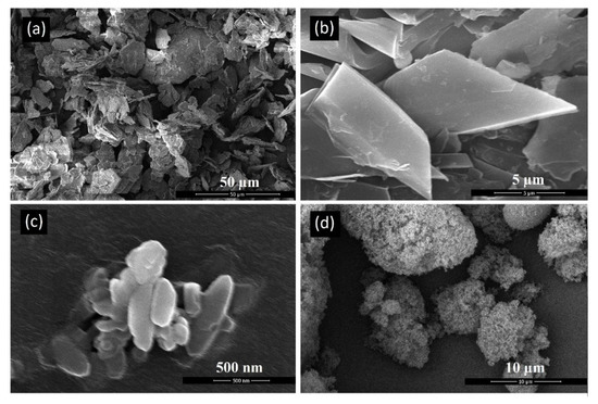 SEM micrographs of the initial powders (a,b) talc, (c) calcium carbonate, and (d) silica.