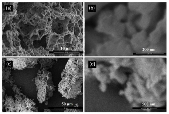 SEM micrographs of akermanite powders produced after ball milling the initial materials for (a,b) 10 h and (c,d) 20 h with subsequent annealing at 900 °C for 1 h.