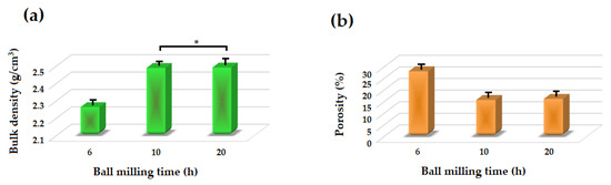 Figure 7 depicts the density and porosity of the akermanite tablets. With increasing the ball milling time, the density of the tablets increased while their porosity decreased due to the release of more gases during the ball milling process and subsequently less volatile materials left the system during the sintering procedure. Also, with increasing the ball milling time more uniform powders were formed which caused the formation of pure akermanite bioceramic. During the sintering process, the release of vacant sites from the tablets caused an approximately 15% shrinkage in the tablets. The density of the samples was highest at 2.487 and 2.489 g/cm3 for the ball milled samples for 10 and 20 h, respectively.