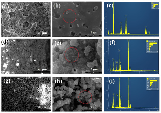 SEM images and EDS spectra of akermanite obtained from 20 h ball milled samples with subsequent annealing at 900 °C for 1 h (a–c) before, (d–f) after 14 days and (g–i) after 28 days soaking in SBF solution.