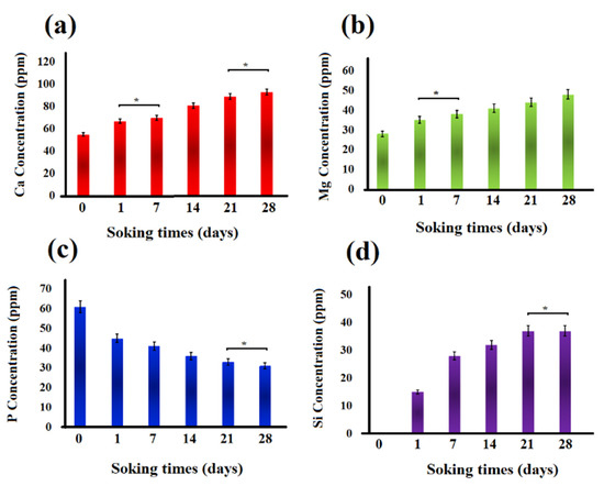 Ion concentration changes in the SBF solution: (a) Ca, (b) Mg, (c) P, and (d) Si ions. (* not significantly different).