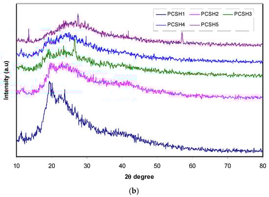 X-ray diffraction is a technique that is widely used to identify amorphous and the crystalline phases of electrolyte film samples. The XRD pattern was used to examine the structural changes of the selected SPE film blends. Figure 1a,b illustrates the X-ray diffraction pattern of pure PVA/CS and doped blend systems at room temperature [15,40]. Both pure PVA and CS exhibit semicrystalline behavior [27]. However, through the blending of these two polymers, the peaks became broader, with a drop in their intensities indicating the increase in the amorphous region in the blended system (as shown in Figure 1a). It can be noticed that the increase of the NH4SCN salt concentration up to 40 wt.% suppressed the intensity of the peaks of the PVA/CS blend film. This implies that a clear interaction occurred between the dopant salt and the polymer blend, which resulted in the disappearance of the sharp crystalline peaks of the NH4SCN salt. Further addition of the salt, reaching 50 wt.%, resulted in the appearance of some sharp peaks, which could be related to the occurrence of salt recrystallization. This is related to the salt recrystallization process, which occurred at high NH4SCN content. For example, a crystalline peak at about ° appeared in PCSH3 and PCSH4 and shifted to ° in PCSH5; this peak did not exist in other samples. Similarly, another crystalline peak appeared at around ° for the PCSH5 sample and did not exist in the rest of the samples. These peaks are clear evidence of the recrystallization process at high salt content. These observations are also supported by the results obtained using the FESEM technique showing that the surface roughness of the PCSH5 electrolyte film increased (as discussed in a later section). This is referring to the ion’s recombination and formation of ion clusters at the film surface, which caused the loss of a large number of ionic species and the reduction of conductivity [36,41]. Previous studies suggested that the amorphous nature, which is more favorable for the conduction in the Pes, is highlighted by the widening of the X-ray diffraction peaks, also suggesting that the DC ionic conductivity is greater for larger amorphous regions. The variation in the free volume of a polymer influences its molecular motion and physical properties. The polymer blends based on PVA/CS lead to additional free volume, which in turn speeds up the migration of ions at an optimal concentration of the dopant salt. It can be detected that the development of the amorphous region with increasing concentration of the NH4SCN salt is due to the higher intra- and intermolecular forces of hydrogen bonding, which results in the polymer chain structure having softer nature [42,43]. Thus, the broader peak in the XRD pattern of PCSH4 film electrolyte is considered indicative of some kind of interaction between the blended polar polymer and the dopant salt. The PCSH4 electrolyte had the maximum DC ionic conductivity, as will be discussed later. Finally, the inorganic salt of NH4SCN has shown a great influence on reducing the crystallinity phases of PVA/CS blended SPEs, since both PVA and CS are semicrystalline polar polymers [8,10].