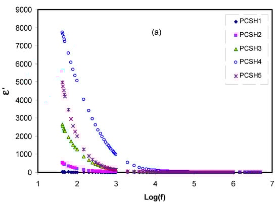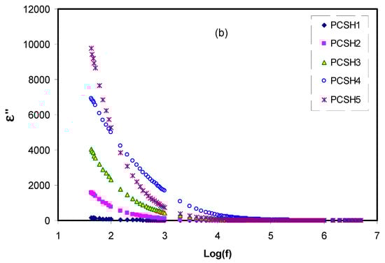 where ω is the angular frequency of the applied filed (ω = 2πf); ε′ and ε″ are the dielectric constant and dielectric loss, respectively; and Co is the vacuum capacitance, which is given by εoA/t, where εo is the permittivity of free space, A is the electrode cross-sectional area, and t is the film thickness. Figure 4a,b presents the real part (ε′) and the imaginary part (ε″) of the dielectric parameters as a function of frequency at room temperature for the polymer blend electrolyte samples. It can be observed that the dielectric permittivity parameters (ε′, ε″) are maximum at low-frequency regions owing to electrode polarization (EP) and high density of charge carriers [56,57,58]. In contrast, at the high-frequency region (>10 kHz), the values of dielectric permittivity are significantly not dependent on frequency. A sharp rise in the dielectric constant (ε′) was particularly recorded for the PCSH4 electrolyte due to the existence of the high number of ions and maximum ionic conductivity. The PCSH1 exemplified roughly constant behavior, whereas the PCSH2 showed a steady increase. Correspondingly, the ion dispersion was reduced as the dielectric constant dropped quickly at the high-frequency region, decaying to a constant value of 1.2 when log (f) reached above 4 [59,60]. It is obvious in Figure 4a as the amount of the doped salt increased up to 40 wt.% of NH4SCN, the value of the dielectric constant gradually increased. However, for 50 wt.%, the values of the dielectric constant (ε′) dropped due to the aggregation of ions and the decrement of DC conductivity [44,51].