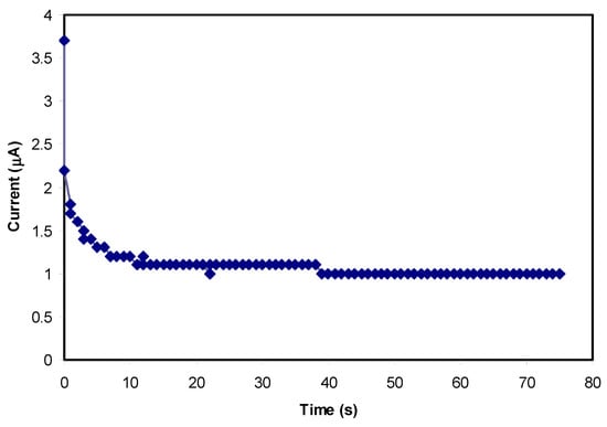 The TNM technique was employed successfully to estimate the behavior of the particular conduction species in the PVA/CS/NH4SCN blend SPE systems using the DC polarization process. Additionally, to confirm the real behavior of the ions in the PCSH blended SPE films, the TNM study is vital. Regarding this, the nature of ions can be determined by calculating the overall transference number of ions (tion), which is responsible for the DC ionic conductivity in the polymer-based electrolytes [65,66]. Figure 6 and Figure 7 show the plots of polarization current against time at the applied voltage of 0.2 V for the PCSH4 and the PCSH5 films having 40 wt.% and 50 wt.% NH4SCN salt added, respectively. Clearly, from the TNM schemes, it can be seen that the initial total current flow dropped quickly and reduced with time. The electrolyte was polarized once it reached the steady state, whereas, the rest of the current stream was a result of electron carriers due to the blocking of cations and anions by stainless-steel (SS) electrodes, which only allow electrons to pass [67,68,69,70]. The following equations were used to determine the values of both electron (te) and the ion (tion) transference numbers [38]: