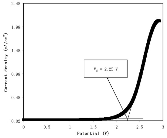 Another critical parameter of SPEs used in energy storage device applications is the electrochemical stability. Through employing linear sweep voltammetry (LSV), the electrochemical stability of the largest conducting sample of PVA/CS/NH4SCN system was investigated at 10 mV s−1. Figure 8 represents the LSV plot of the most conductive PCSH4 film sample at room temperature. A decomposition potential series was measured in the range of 0 to 3 V at the scan rate of 10 mV s−1 for the prepared cells using SS electrodes, in which no clear increase in the value of current was observed up to 2.25 V [73,74,75]. The decomposition voltage of the sample was calculated to be 2.25 V at ambient temperature. The sharp ascent of the current density was observed beyond 2.25 V, which is due to the decomposition of the sample at the surface of the SS electrodes. A high electrochemical stability window was obtained for the polymers with the presence of a strong electron-withdrawing group [76,77,78]. The minimum requirement of breakdown voltage for polymer-based electrolytes that can be used in electrochemical device applications is supposed to be ~1 V [17]. Based on the value of the decomposition potential, the PCSH4 film is suitable to be used in energy storage device applications. Table 3 reveals the decomposition voltage for several systems reported in the literature. Previous studies illustrated that in addition to high electrochemical stability, PEs must possess high DC conductivity (10−5 to 10−3 S/cm) to be used for electrochemical device applications [79,80,81]. In our future work, we will focus on the plasticization of the most conductive system of the present work to improve its DC conductivity and TNM value for energy storage application.