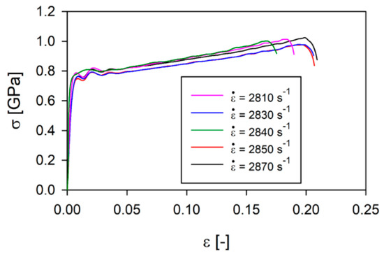 First, the tests were carried out on 316L steel samples made using LENS technology under the same test conditions. From the results of the study, stress and strain values were estimated according to Equations (1)–(6), which allowed for the development of true stress–strain curves, as presented in Figure 2, at an average strain rate of 2840 s−1. It was found that the dispersion in stress values increases slightly with an increase in deformations and is comparable to the material obtained with the classical method. Plastic flow stress values for selected deformations of 5% and 15% are presented in Table 3.