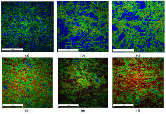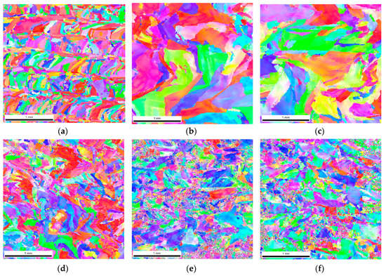 The microstructure illustrated with the reverse map of polar figures obtained with the electron backscattered diffraction (EBSD) method for additively manufactured 316L subjected to dynamic plastic deformation at various rates: (a) not deformed; (b) ε = 970 s−1; (c) ε = 1180 s−1; (d) ε = 1700 s−1; (e) ε = 2830 s−1; (f) ε = 4100 s−1.
