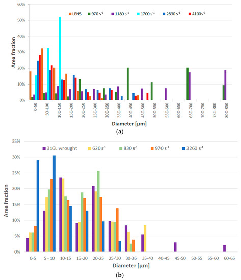 Grain size distribution: (a) 316L samples directly after the LENS process; (b) SS316L alloy subjected to dynamic deformation.