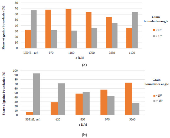 Distribution of the share of low and high angles for the 316L steel samples subjected to dynamic plastic deformation: (a) manufactured with the LENS method; (b) manufactured with the hot forging method.