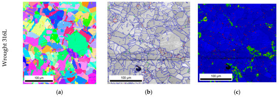 In the case of 316L hot-forged steel subjected to dynamic plastic deformation, the grain size of the reference sample, as well as that of the samples subjected to plastic deformation, is much smaller than it is in the case of the additively manufactured 316L steel (Figure 5b). In the case of the reference sample, 5% of the surface of the analyzed specimens corresponds to a grain size in the range of 45–65 µm.