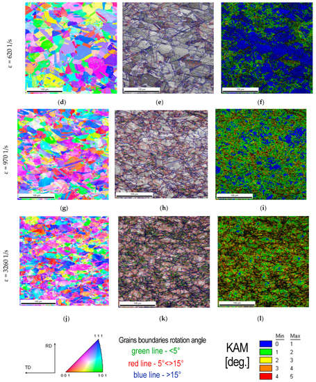 As a result of dynamic plastic deformation in 316L steel manufactured with the laser additive technique, grain growth is observed at low deformation rates of about 1000 s−1 (Figure 4b,c and Figure 5a) In contrast, a further increase in the deformation rate results in grain refinement (Figure 4d–f and Figure 5a). This results from the fact that at low deformation rates, dynamic recovery takes place, and the original structure (layered and with grains of a maximum thickness of about ~0.3 mm) of additively manufactured 316L disappears (Figure 4a and Figure 6a). It should also be noted that immediately after the LENS process, the 316L steel is in a state that is characterized by a bi-modal structure consisting of macro-grains (microstructure), which include sub-grains with a similar crystallographic orientation (dislocation substructure). This is also confirmed by the share of low- and high-angle boundaries: in the 316L steel, immediately after the LENS process, the share of high-angle boundaries is more than twofold greater than that of low-angle boundaries (Figure 6a and Figure 7a).