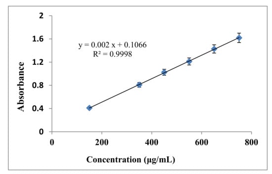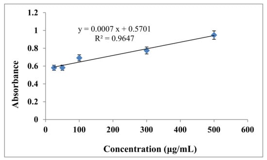 The total flavonoid compositions of the C. viminalis leaf and flower extracts from the quercetin standard calibration curve as presented in Figure 2 were 19.371 and 0.634 QEmg/g using Equation (1). QE is total flavonoid content in quercetin equivalent. The content of flavonoids was higher in the C. viminalis leaf extract than in the flower extract. The calibration curves obeyed the Beer–Lambert law. The regression, slope, and intercept values obtained from the curve were 0.9647, 0.0007 and 0.5701 μg/mL, respectively. Comparing the TFCs of the leaf and flower extracts of C. viminalis, the content of phenol in the flower extract was greater than in the leaf contract, which is in agreement with the literature [].