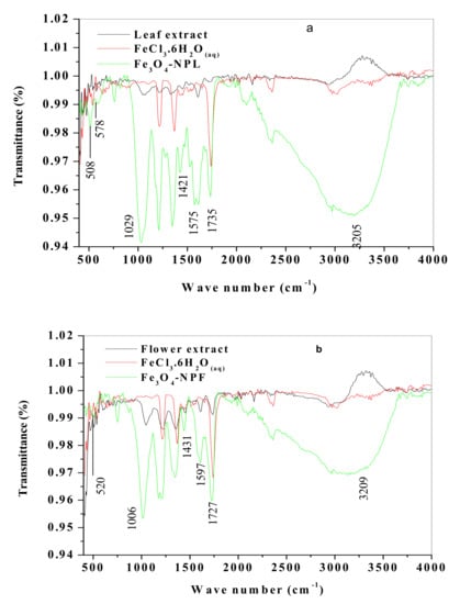 Fourier transform infrared (FTIR) analysis was carried out on the extracts and synthesized Fe3O4-NP in order to determine the compounds and the bonding properties present. In the FTIR spectra (Figure 3a), the leaf and flower extract (Figure 3b) spectrum displayed important vibration peaks at about 3300, 1729, and 1724, which are assigned to the O-H stretch of the alcohol/phenol group and C = O of the carbonyl group (carboxylic acid, aldehyde, ketone) accordingly. These peaks are possible reducing agents that are responsible for the formation of iron (III) oxide nanoparticles. The observed peak at 1735 in FeCl3.6H2O is ascribed to the deformation of water molecules, suggesting the existence of physio sorbed water on the surface of ferric chloride []. The FTIR spectrum of Fe3O4-NP synthesized by the C. viminalis leaf extract (Fe3O4-NPL) showed a reduced intensity in the vibration peaks at 3205 and 1735 corresponding to the O-H stretch of the alcohol/phenol group and the O-H stretch of the carboxylic acid group, aldehyde, and ketone (Figure 3a), respectively. On the other hand, the peak at 508 and 578 cm−1 were the Fe-O stretching of Fe3O4-NP (Figure 3a). For Fe3O4-NP synthesized by the C. viminalis flower extract (Fe3O4-NPF), as shown in Figure 3b, the peaks corresponding to the presence of the alcohol/phenol group (3209) and carbonyl group (1727) were identified, while the peaks at 600 and 520 cm−1 corresponded to the bending and Fe-O stretching of Fe3O4-NPF, respectively. The asymmetry and symmetry stretching vibration of COO− (carboxylate group) that proved the combination of protein with nanoparticles was noticed at 1575 and 1421 and 1597 and 1431 cm−1 on the Fe3O4-NPL and Fe3O4-NPF spectra.