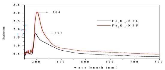 UV–visible spectra of Fe3O4-NPL and Fe3O4-NPF synthesized by leaf and flower extracts, respectively.