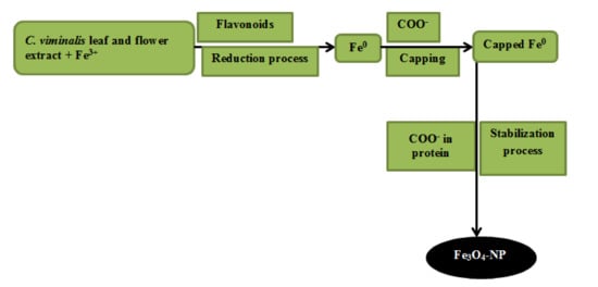 The SEM (scanning electron microscopy) images of Fe3O4-NP synthesized for Fe3O4-NP synthesized by the C. viminalis leaf (Fe3O4-NPL) and flower (Fe3O4-NPF) extracts, respectively, revealed uniformly dispersed, agglomerated [], and nearly spherical in shape Fe3O4-NP with rough surfaces, which suggests absorption of the carboxylate group existing in protein, acting as surfactant to adhere to the nanoparticle surface, resulting in the Fe3O4-NP stabilization as can be seen in Figure 5a,b. The mechanism of absorption is presented in Figure 6.