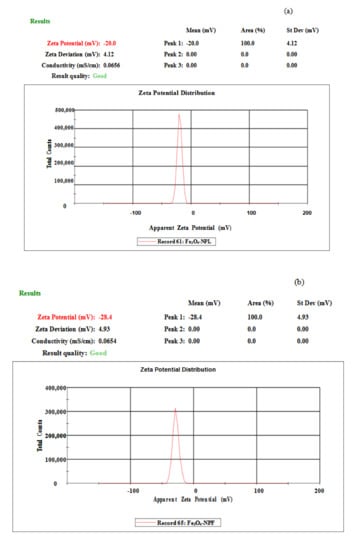 Zeta potential of (a) Fe3O4-NPL and (b) Fe3O4-NPF.