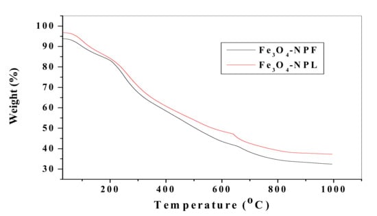 TGA analysis of Fe3O4-NP was conducted with SDT Q600 V20.9 Build 20 thermogravimetric analyser of DSC-TGA standard in an unreactive nitrogen gas environment at a high furnace temperature using the RAMP method and a heating rate of 10 °C min−1. The thermogravimetric curves of Fe3O4-NP synthesized from the C. viminalis leaf (Fe3O4-NPL) and flower (Fe3O4-NPF) extracts are shown in Figure 9 with three stages of weight loss. In Fe3O4-NPL and Fe3O4-NPF, the first stage lies within 25–65 °C and 29–58 °C with an insignificant weight loss (1%), which could be attributed to loss of water and volatile solvents. The second stage started at 65 and 58 °C for Fe3O4-NPL and Fe3O4-NPF accordingly and ended at 197 °C with a weight loss of 13% and 10%, respectively, and could be assigned to loss of water due to crystallization and gas desorption. Finally, the third stage at 636 and 654 °C for Fe3O4-NPL and Fe3O4-NPF had a significant weight loss of 44% and 50%, which could be assigned to the transition phase of Fe3O4 to FeO since FeO is stable (thermodynamically) at temperatures above 570 °C [] with a reaction formula at a possible equilibrium phase: