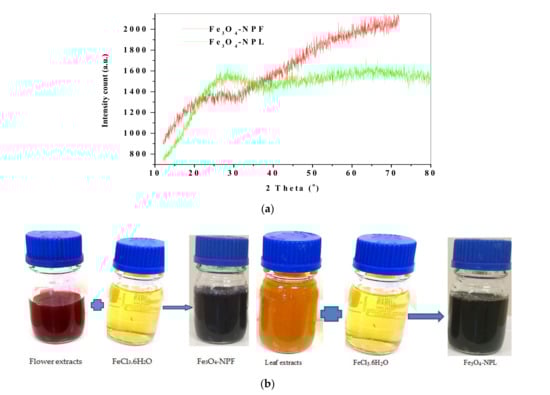 The XRD spectra (Figure 10a) of synthesized Fe3O4-NP from the C. viminalis leaf (Fe3O4-NPL) and flower (Fe3O4-NPF) extracts conducted from 20° to 80° at 2 theta were closely similar to those reported in the literature [,].
