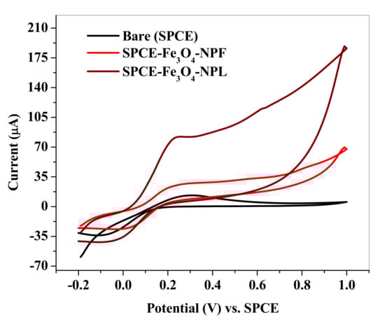 Cyclic voltammogram of bare SPCE, SPCE-Fe3O4-NPF, and SPCE-Fe3O4-NPL at 25 mVs−1 scan rate in 0.1 M PBS (pH 7.4) containing 5 mM K3Fe(CN)6 solution.