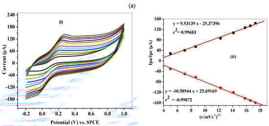 Cyclic voltammogram obtained for (a(i)) SPCE/Fe3O4-NPL and (b(i)) SPCE/Fe3O4-NPF in PBS pH 7.4 containing 5 mM K3Fe(CN)6 solution (scan rate: 25–300 mVs−1; inner to outer) and linear plots of Ipa/Ipc vs. square root (a(ii)) and (b(ii)) of scan rate for SPCE-Fe3O4-NPL and SPCE-Fe3O4-NPF, respectively.