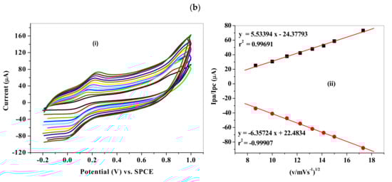 In the Ip maximum current (amperes), A is the electrode area of SPCE (0.1257 cm2), C is the concentration of the bulk solution (mol/cm3), and v is the scan rate in Vs−1. The surface concentrations of the respective modified electrodes (SPCE-Fe3O4-NPL and SPCE-Fe3O4-NPF) were calculated to be 3.47 and 1.91 μmol/cm2 by applying Equation (4).