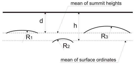 Figure 1 shows a scheme of the contact of two rough surfaces. A separation of surfaces measured from the summits mean plane is called d, while h means a separation based on surface heights. R1, R2, and R3 are radii of the summits in contact. One can see that radius of summits, density, and height of summits are important parameters in contact mechanics.