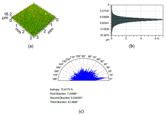 Isometric view (a), ordinate distribution (b), and directionality plot (c) of surface texture after vapor blasting.