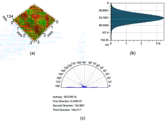 Isometric view (a), ordinate distribution (b), and directionality plot (c) of surface texture after polishing.
