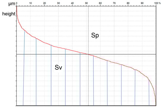The Sv parameter is the maximum valley depth (Sz = Sp + Sv). Figure 6 presents the graphical interpretation of the Sp and Sv parameters. Sv describes the area under, while Sp the area above the material ratio curve. This curve presents the cumulative distribution of surface ordinates. The Sv parameter presents material, while Sp presents void (emptiness). The Rp/Rz or Sp/Sz ratios are called the emptiness coefficient. One can believe that when this ratio is smaller, the wear intensity is also lower [41].
