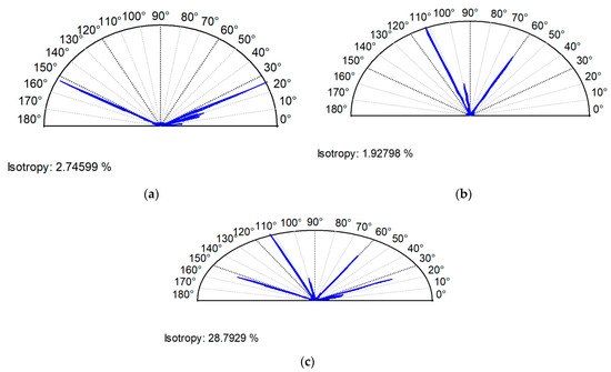 The errors of the Sq, Sdq, Ssc, Sds, Sp/Sz, Sq/Sa, and Sal parameters’ predictions were smaller than 4.5%. Two surfaces were characterized by slightly negative values of skewness. Similar to surfaces analyzed earlier, the skewness of the sum surface was higher than predicted (the relative error was about 30%), but the kurtosis was smaller (the error was about 16%) than predicted. The parameter Str of the equivalent sum surface was higher by about 17% than the predicted parameter. Addition of anisotropic honed surface to isotropic surface after vapor blasting caused a decrease in an isotropy ratio compared to isotropic texture. However, the change was lower than predicted. Figure 11 shows the contour plots and Figure 12 shows the directionality plots of surfaces E and F and of the sum surface.