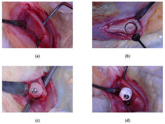 Experimental surgery procedure: (a) Surgical exposure of the recipient bed; (b) Autogenous bone block grafting procedure; (c) Autogenous block grafted in the autogenous group; (d) Biomaterial block grafted in the biomaterial group.