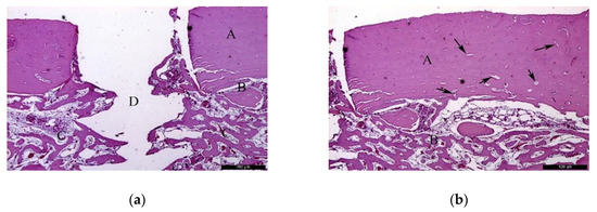 Histological analysis of the autogenous group (AG) at 30 days. (a) Autogenous bone graft (A) positioned over the recipient bed (B), trabeculae in maturation stage and good vascularization (C); space previously occupied by the osteosynthesis screw is recognizable in (D). Hematoxylin and eosin stain at a magnification 40×; (b) Autogenous bone (A) newly formed bone (B), and small areas of resorption (black arrows). Hematoxylin and eosin stain at a magnification 125×.